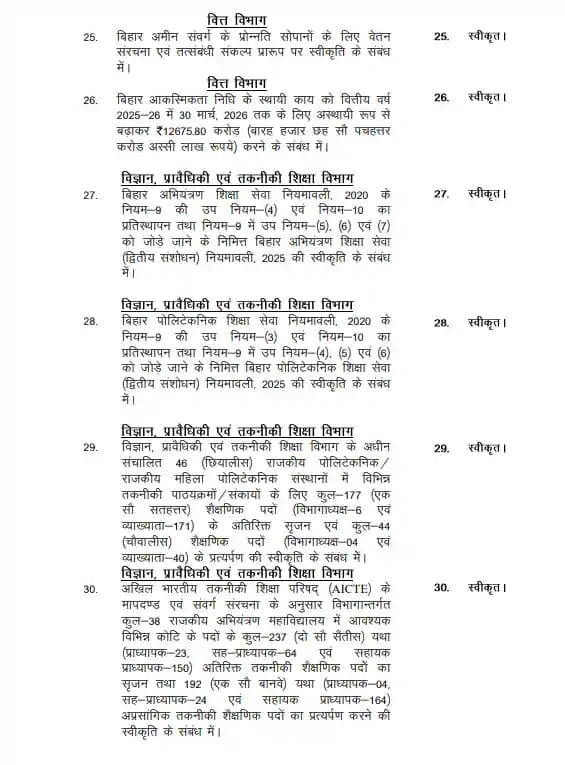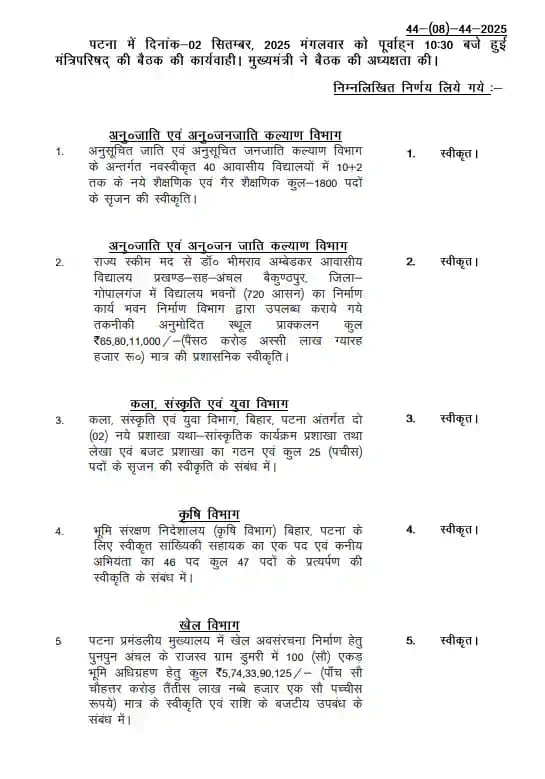 पटना: मुख्यमंत्री नीतीश कुमार की अध्यक्षता में मंगलवार को हुई बिहार कैबिनेट की बैठक में 48 एजेंडों पर सहमति बनी। बैठक में स्वास्थ्य, शिक्षा, कृषि और आर्थिक विकास से जुड़े कई प्रस्तावों पर चर्चा हुई और उन्हें मंजूरी दी गई। इन फैसलों का सीधा असर आम जनता पर पड़ेगा।