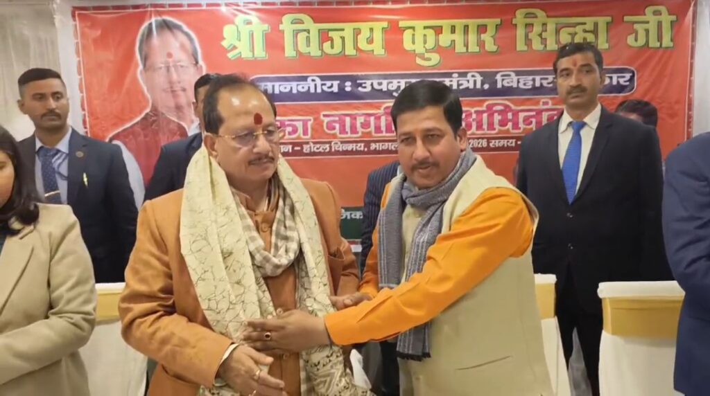 बिहार के उपमुख्यमंत्री एवं भूमि एवं राजस्व सुधार मंत्री विजय कुमार सिन्हा सोमवार को भूमि सुधार एवं जन-जनकल्याण संवाद कार्यक्रम में शामिल होने भागलपुर पहुंचे। उनके आगमन पर शहर के एक होटल में नागरिक अभिनंदन कार्यक्रम आयोजित किया गया, जहां बड़ी संख्या में एनडीए कार्यकर्ताओं, जनप्रतिनिधियों और सामाजिक संगठनों के प्रतिनिधियों ने उनका गर्मजोशी से स्वागत किया।