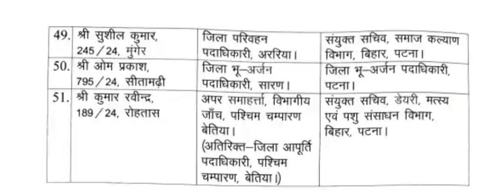 भूमि सुधार से जुड़े विभागों में भी फेरबदल किया गया है। औरंगाबाद, नालंदा और रोहतास में नए बंदोबस्त पदाधिकारी तैनात किए गए हैं, जबकि पटना, दरभंगा और पूर्णिया को नए जिला भू-अर्जन पदाधिकारी मिले हैं।