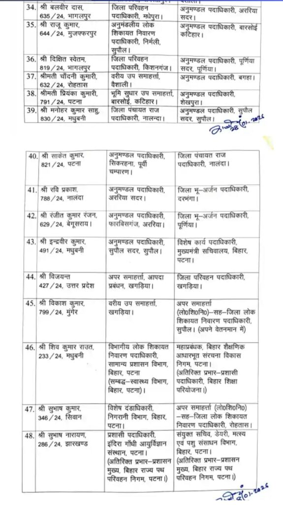 वहीं मैदानी प्रशासन को मजबूत करने के लिए मोहनियाँ, सिकरहना, अररिया सदर, बगहा, शेखपुरा और महुआ सहित कई अनुमंडलों में नए एसडीओ की नियुक्ति की गई है।